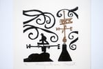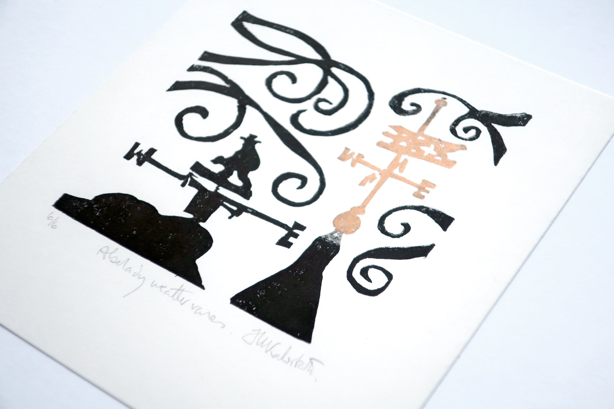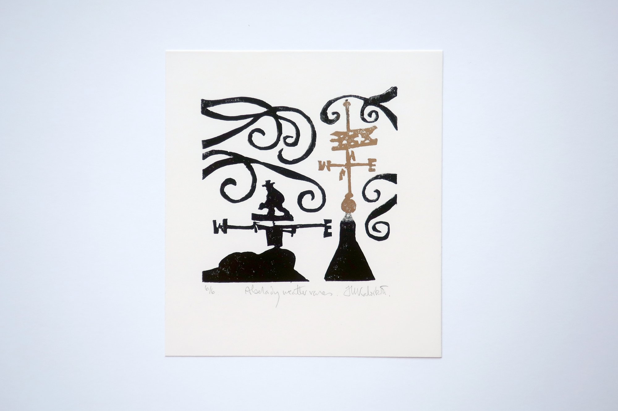 Limited edition original linocut print, based on weather vanes in Aberlady East Lothian.