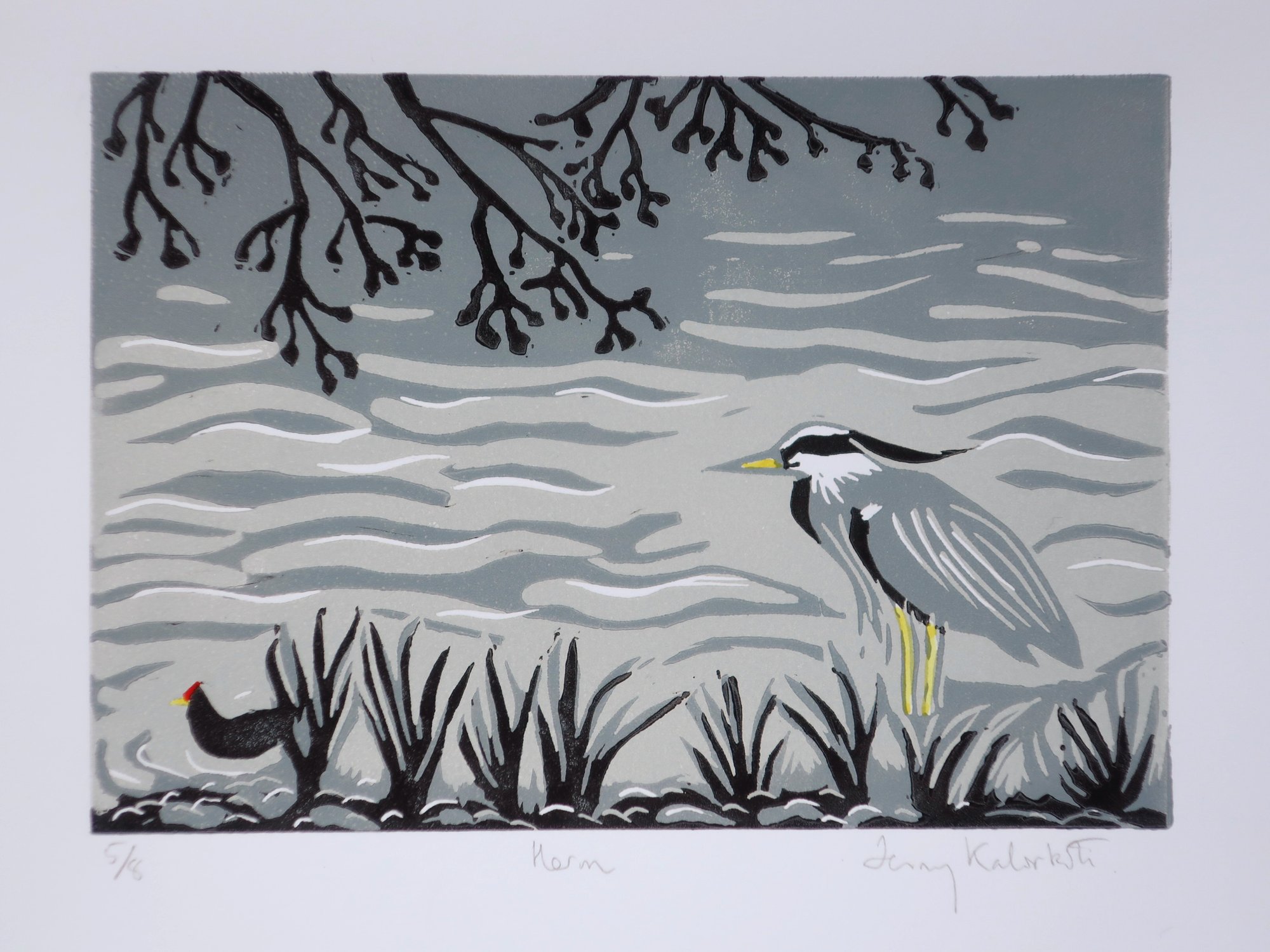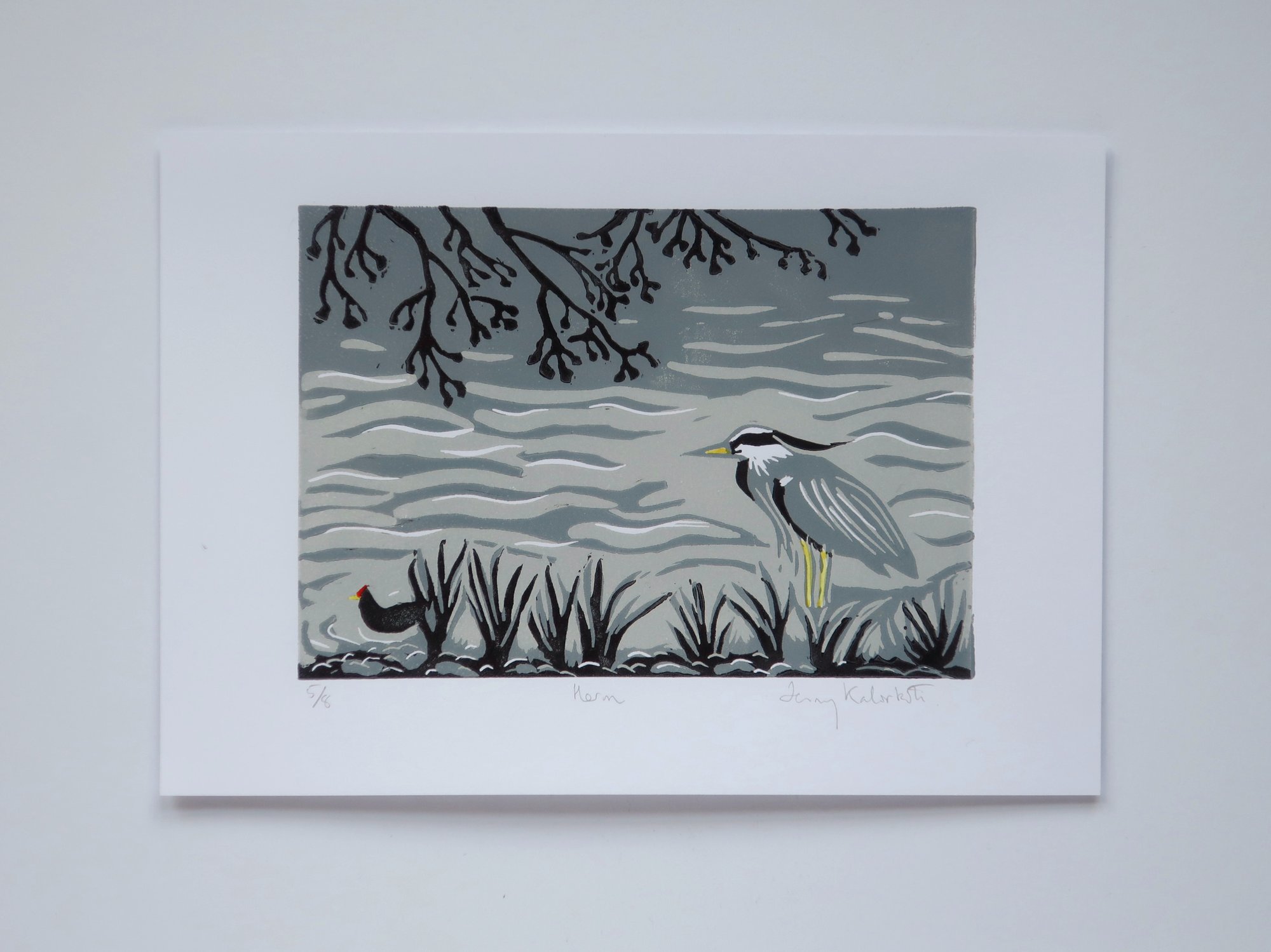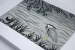 A Limited Edition Handprinted Linocut featuring a Heron and Moorhen on the Water of Leith in Edinburgh.