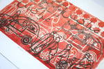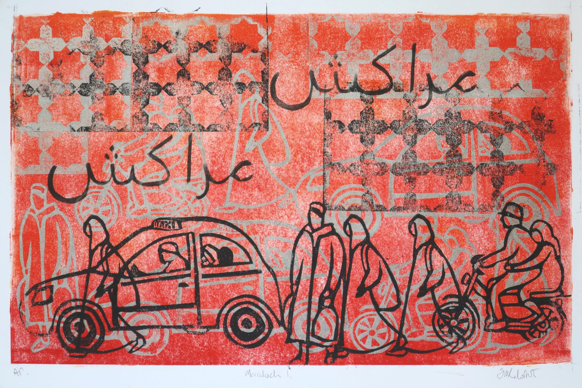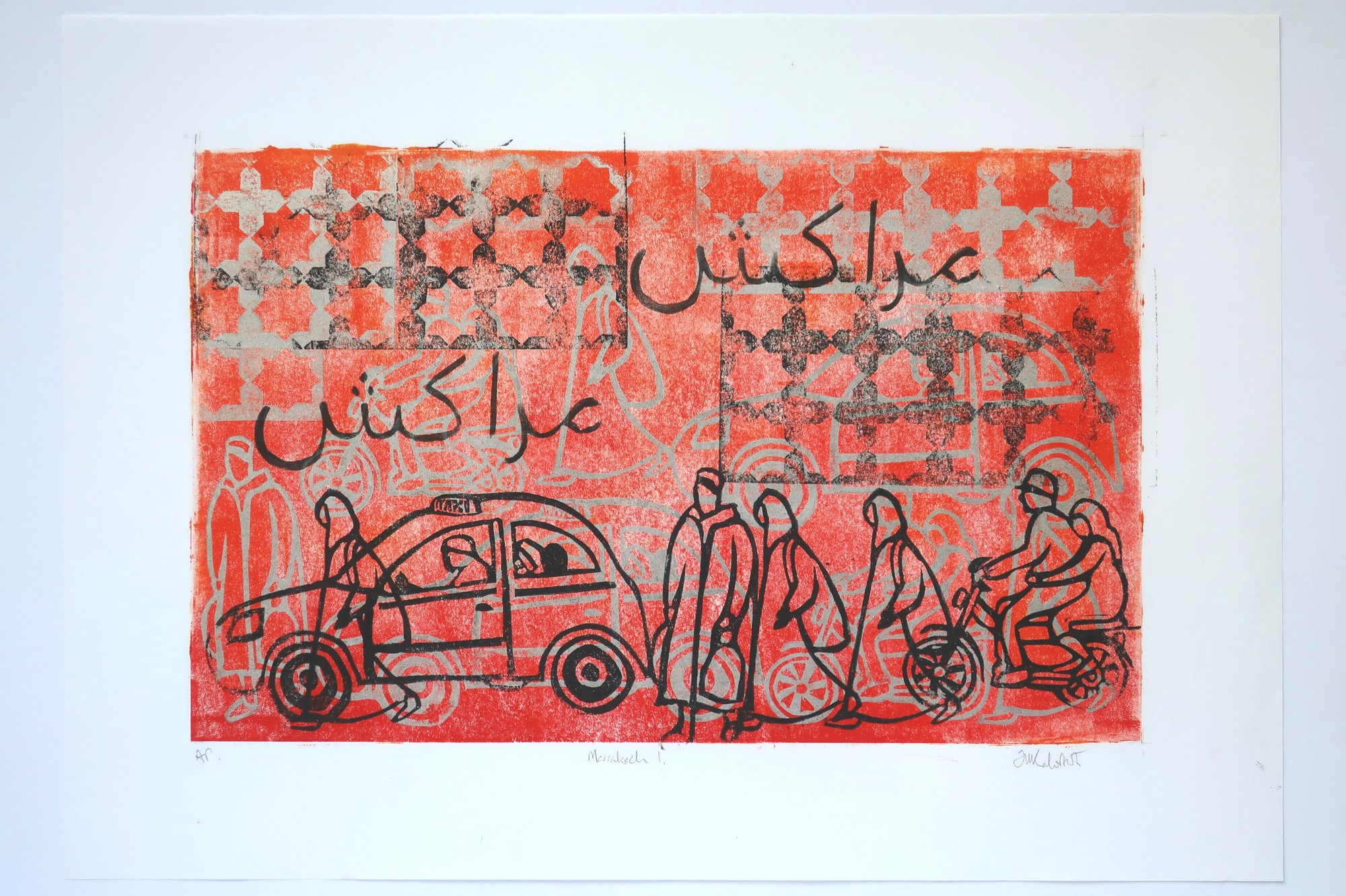 A Limited Edition Handprinted Linocut representing the chaos of Marrakech. Inspired by my photographs and drawings done on holiday there.