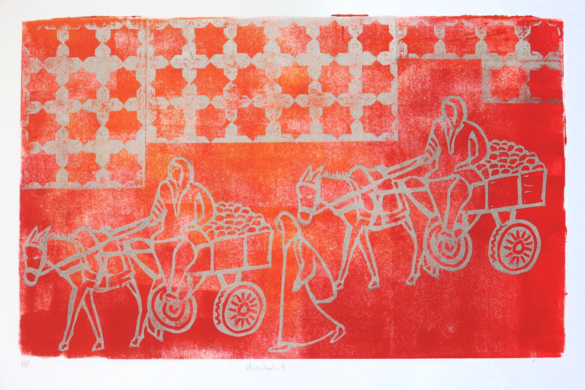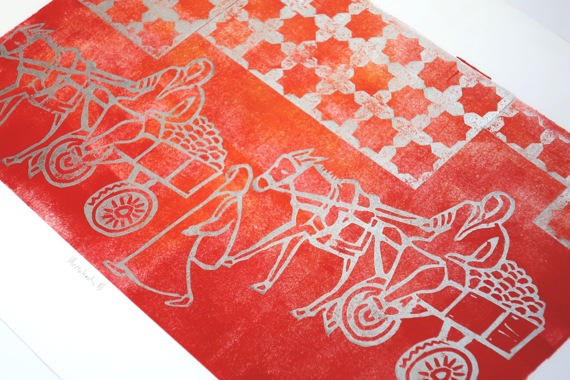 A Limited Edition Handprinted Linocut representan the chaos of Marrakech. Inspired by my photographs and drawings done on holiday there.