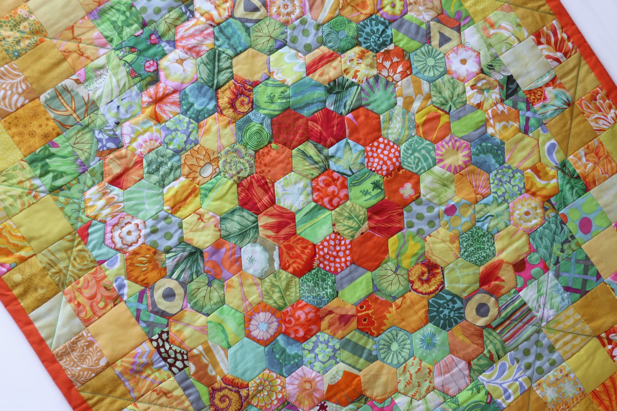 This handmade quilt features a hand stitched English paper piecing flower appliquéd onto a patchwork background. Backed in Kaffe Fassett's Mille Feuille fabric.